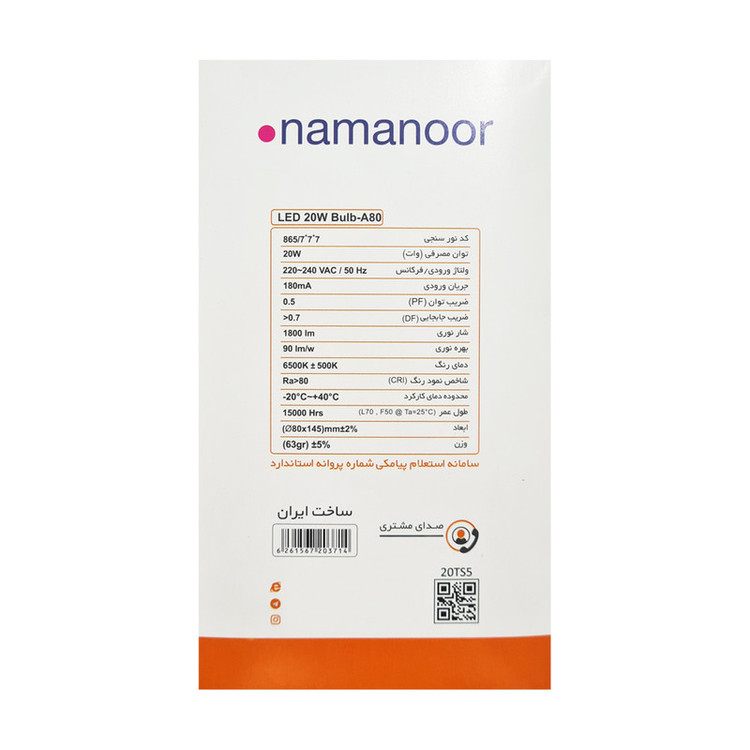 لامپ ال ای دی 20 وات نمانور مدل bulb-A80 پایه E27 بسته 10 عددی